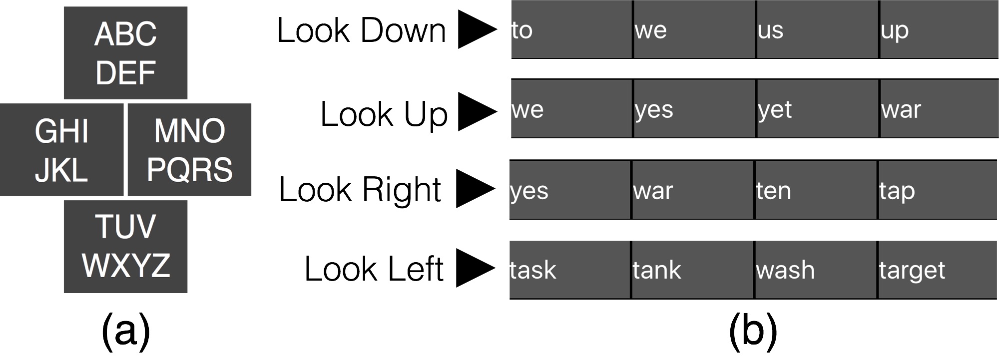 Our app implements a predictive text engine to find all possible words that could be created with the letters in the groups indicated by a gesture sequence. To enter one character, the speaker moves his eyes in the direction associated with that letter’s group; the communication partner swipes in the corresponding direction on the phone screen. For example, to enter the word TASK (Figure 1.b), the speaker first looks down for T, then looks up for A, looks right for S, and looks left for K.