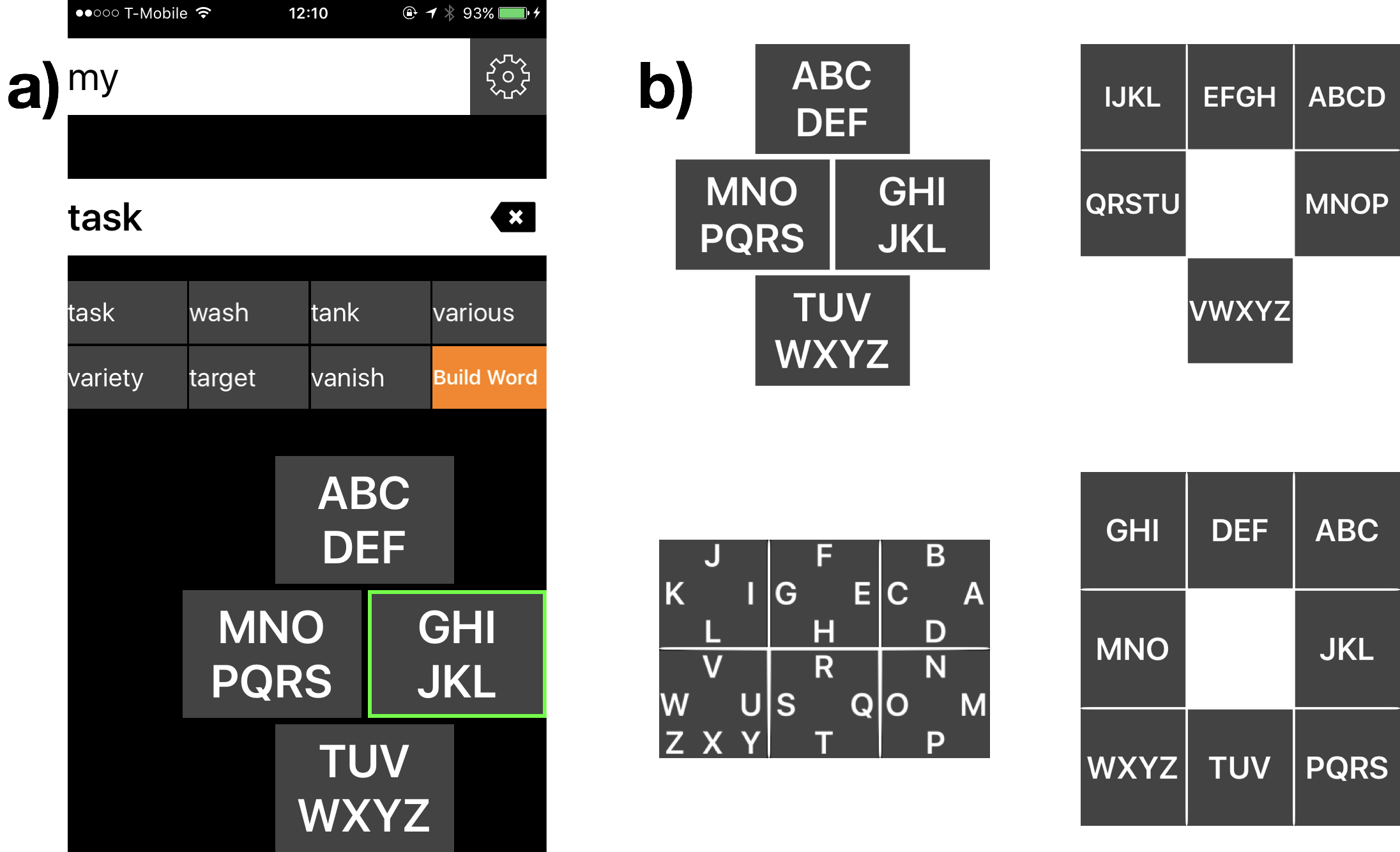To reduce fatigue and increase throughput, our app uses four simple eye gestures (up/down/left/right) to refer to all 26 letters of the English alphabet, using only one gesture per letter entered. This design leads to an ambiguous keyboard (Figure 1.a) in which the letters of the alphabet are clustered into four groups that can each be indicated with one up/down/left/right gesture. On the back of the phone, a four-key image reminds the speaker of the letter groupings associated with each of the four gesture directions; you can print the keyboard layout image file and tape it to the back of your phone for easy reference by the speaker. SwipeSpeak also supports multiple keyboard layouts, each having a different number of possible eye gesture directions (Figure 2.b).