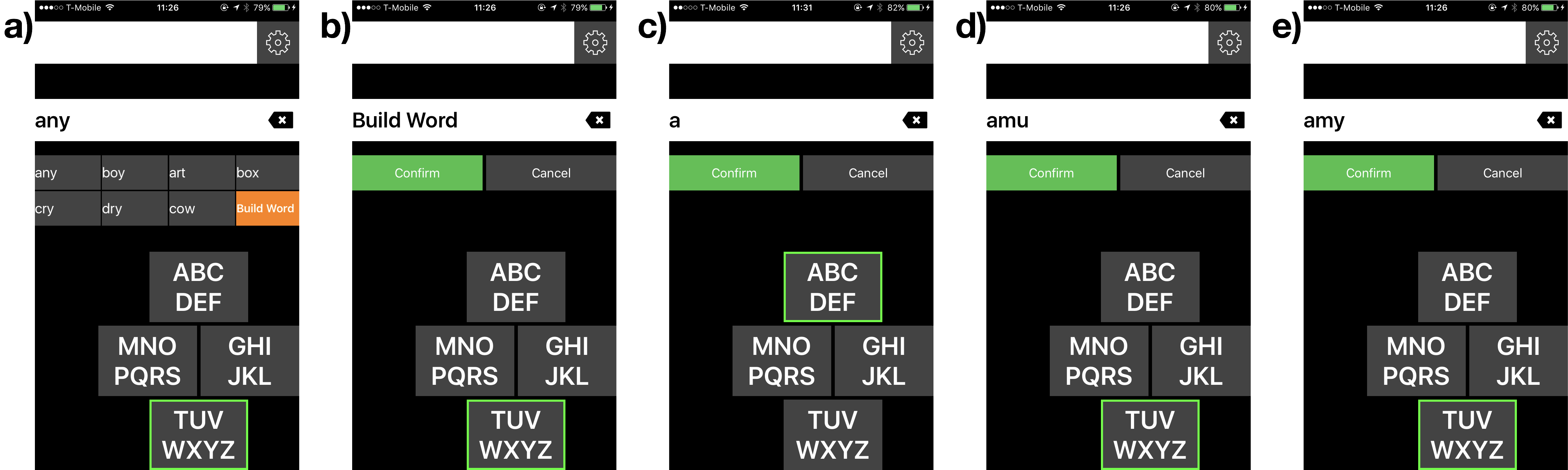 To build a word, SwipeSpeak will use the most recent gesture sequence before hitting the "Build Word" button. Then, for each gesture in the sequence, SwipeSpeak will read all letters in the key associated with that eye gesture direction. When the desired letter is spoken, the speaker uses a gesture to confirm the letter. The communication partner sees the confirmation gesture and touches the "Confirm" button. The communication partner can touch the "Cancel" button any time to restart typing if the speaker indicates the word is wrong (Figure 1.b).